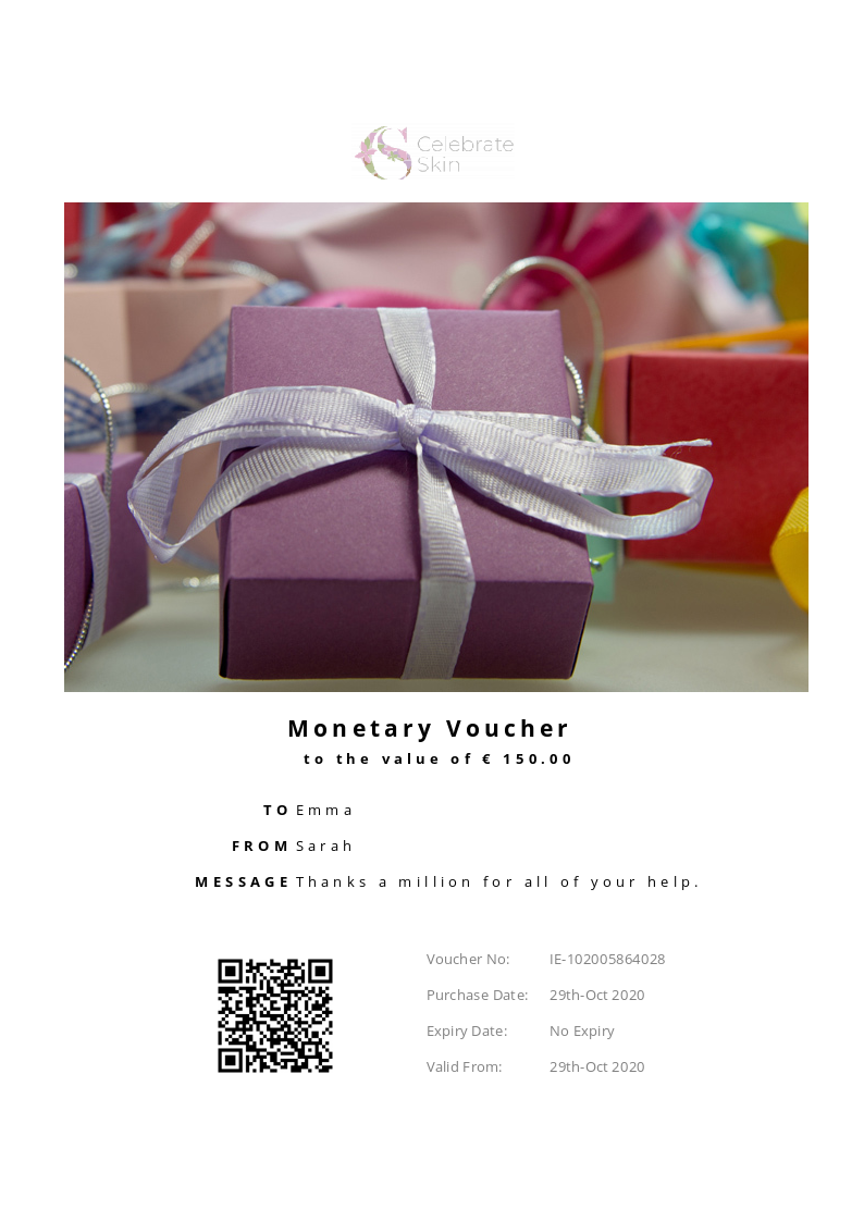 Celebrate Skin allows you to purchase instantly printable gift vouchers, special offers and tickets using the Voucher Connect platform.